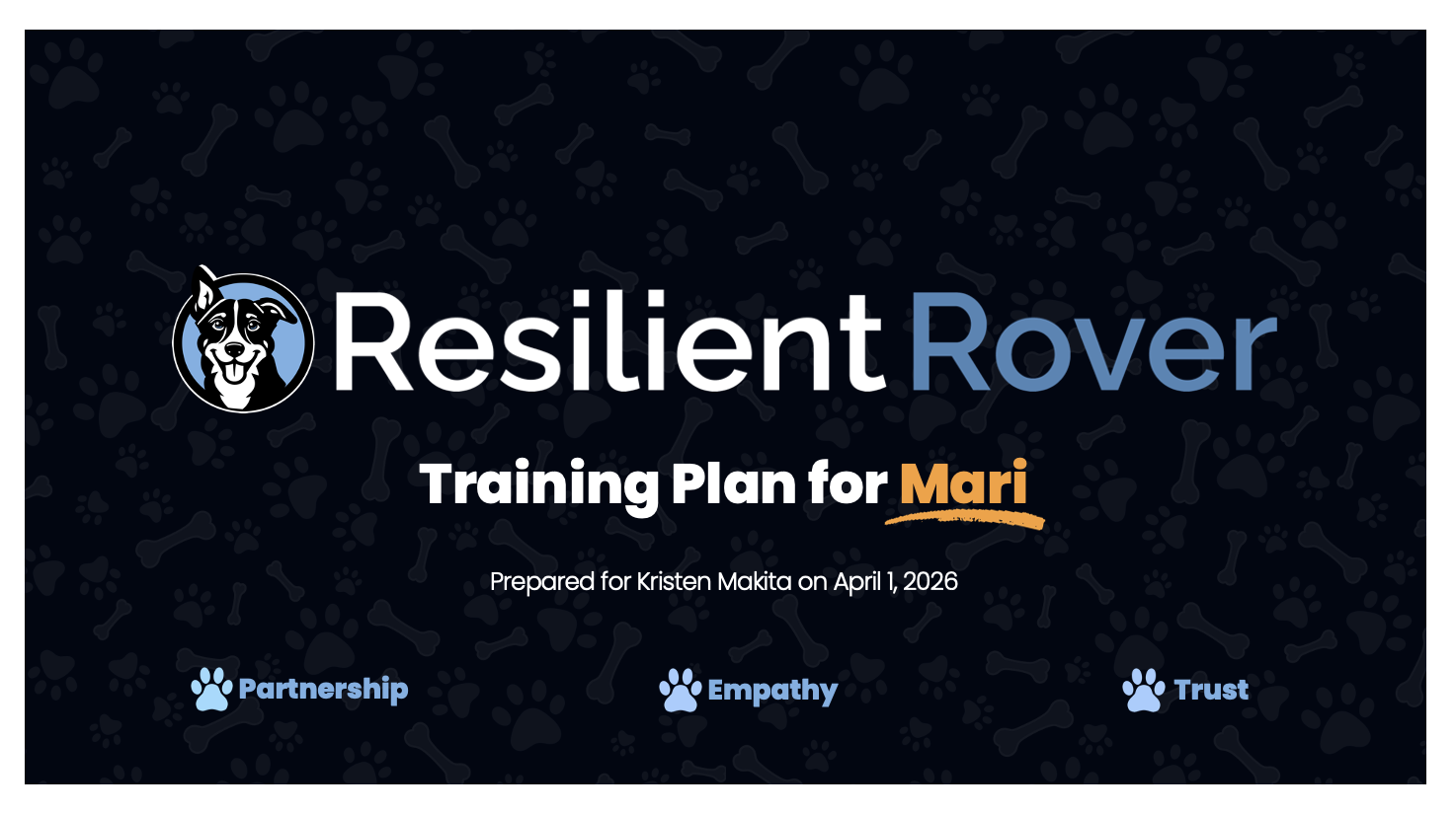 Below, you’ll find your customized training plan. As we begin working together, this page will evolve into our shared workspace — where appointments are scheduled, videos and files are exchanged, milestones are tracked, and more. Our goal is to make Mari’s growth organized, collaborative, and low stress.