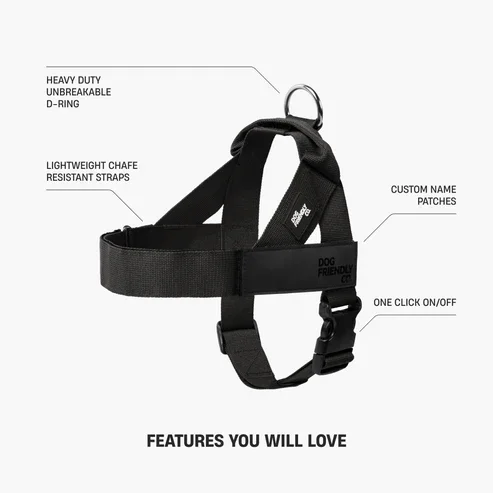 We love the one-clip no-pull harness from Dog Friendly Co. In fact it’s the only harness we carry. With one-clip attachment, it’s minimally invasive. And with customizable velcro patches on both sides, we can communicate just about anything to the others around us.
