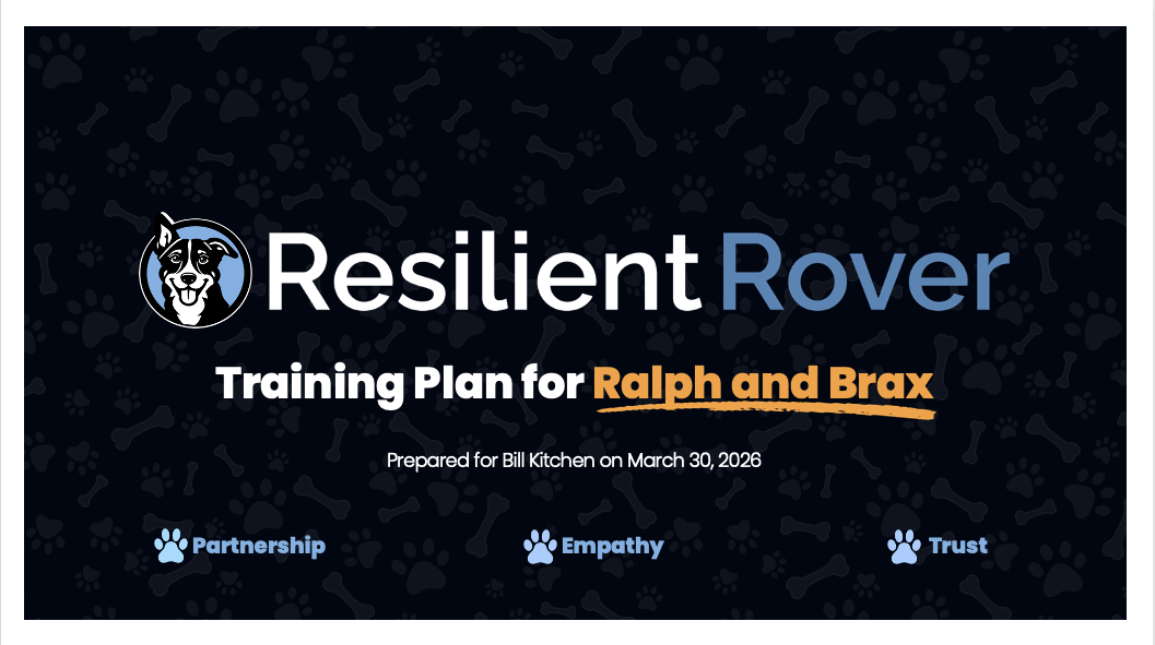 Below, you’ll find your customized training plan. As we begin working together, this page will evolve into our shared workspace — where appointments are scheduled, videos and files are exchanged, milestones are tracked, and more. Our goal is to make Ralph’s and Brax’s growth organized, collaborative, and low stress.